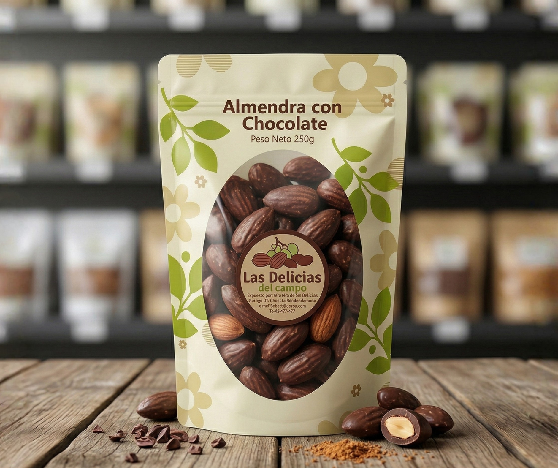 Almendra con chocolate 200 gr, arándano con chocolate 200 gr, bombón cubierto con chocolate 150 gr, choco oreo 200 gr, almendra confitada 200 gr.