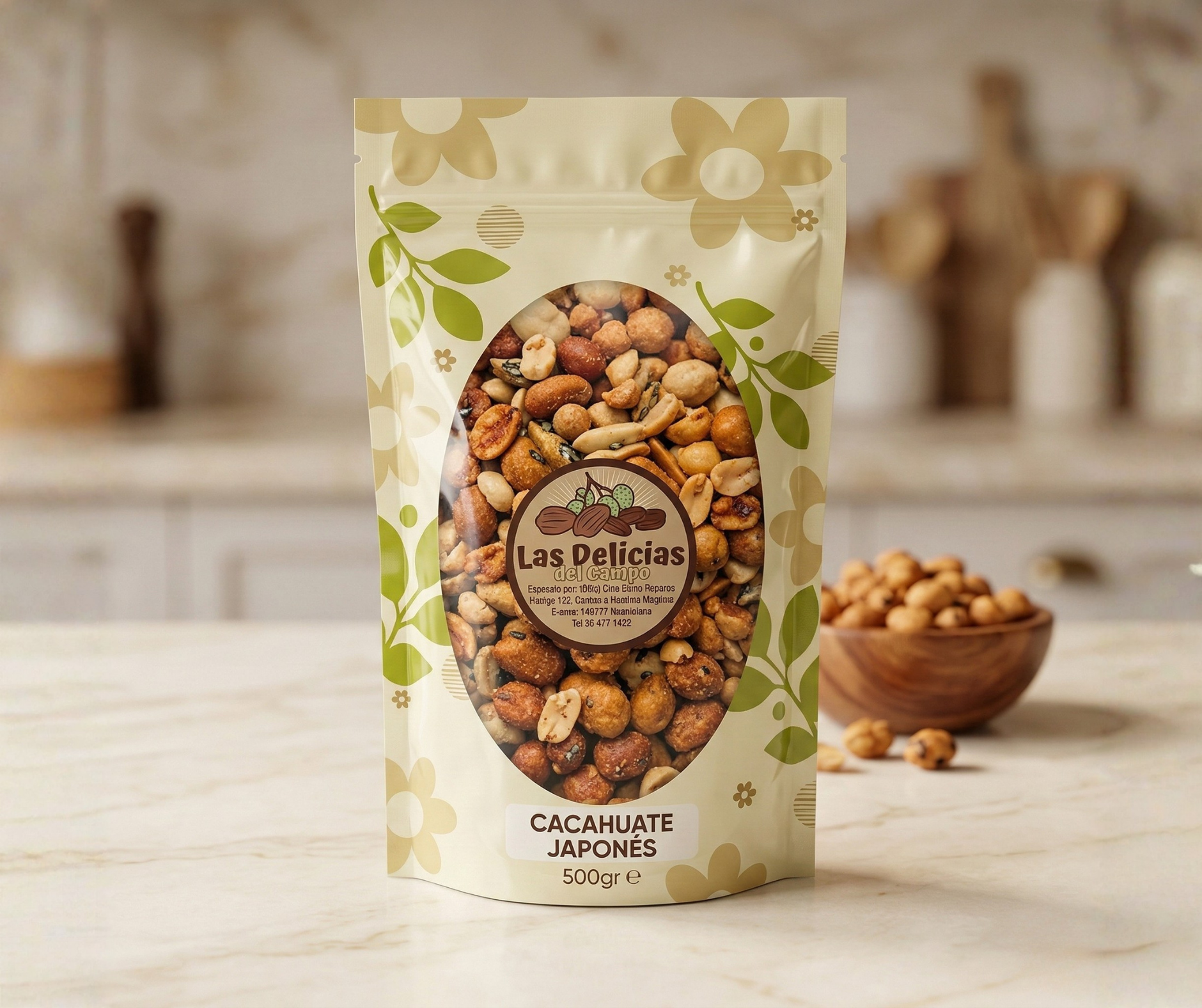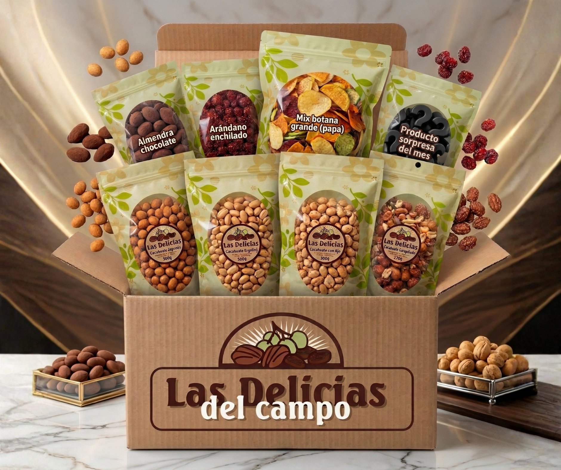 Todos los productos en una presentación de 500 gr: cacahuate japonés, cacahuate español, cacahuate español con ajo, cacahuate garapiñado con ajonjolí, almendra con chocolate, arándano enchilado, botana papa con tajín, producto sorpresa papatina.
