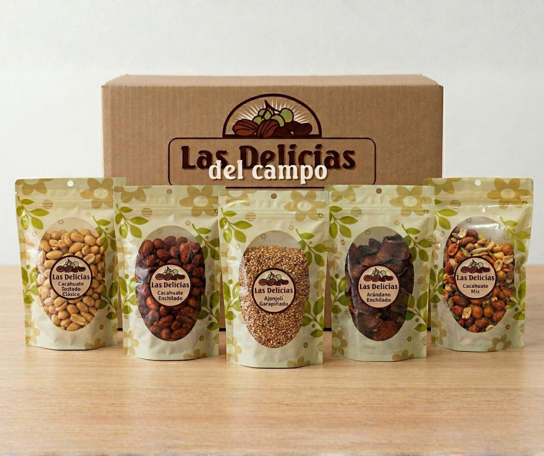 Cacahuate (dos paquetes de diferentes cacahuates) 200 gr cada uno, cacahuate mix 200 gr, ajonjolí garapiñado 200 gr, arándano enchilado 200 gr.